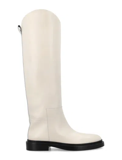 leather knee-high riding boots from JIL SANDER featuring off-white, calf leather, pull-tab at the heel, round toe, pull-on style, rubber sole and knee-high.