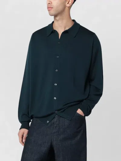 Dark green wool cardigan by John Smedley, featuring shirt-style collar, long sleeves, button front closure, and ribbed trims.