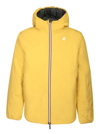 Reversible K-Way down jacket in yellow/military green nylon. Quilted green side, smooth yellow side. Padded with goose down. Waterproof. Water repellent. Windproof. Hood with drawstring. Double slider zip closure. 2 zipped pockets. 2 pockets with press studs. Drawstring at the bottom. Elasticated wrists. Front logo. Measurement in photo L 100% polyamide Padding: 90% down, 10% feather Composition: Nylon-piuma Doca