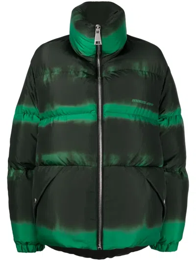 草绿色、羽绒填充、衬垫设计、褪色效果、胸前饰有logo印花、高领、正面饰有拉链、两个侧置摁扣口袋、长袖、弹性松紧边、摁扣袖口、平直下摆。