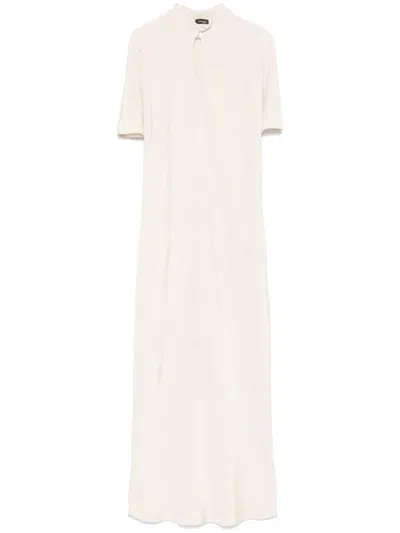 米色 真丝混纺 斜纹织物 钥匙孔领口 双搭扣 直领 短袖 吊带廓形 平直下摆 中长