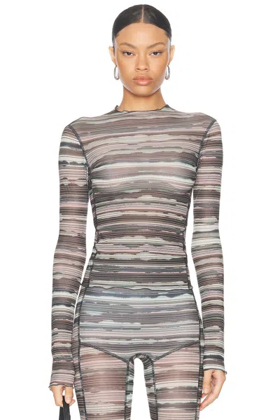 KNWLS Halcyon Top in Bleach Stripe - Grey. Size L (also in M, S, XS). 83% polyester 17% elastane. Made in Portugal. Machine wash. Pull-on styling. Mockneck styling. Light-weight jersey fabric with lettuce hem design. Item not sold as a set. KNLF-WS15. FW24-HT0BLSTRIPE. About the designer: