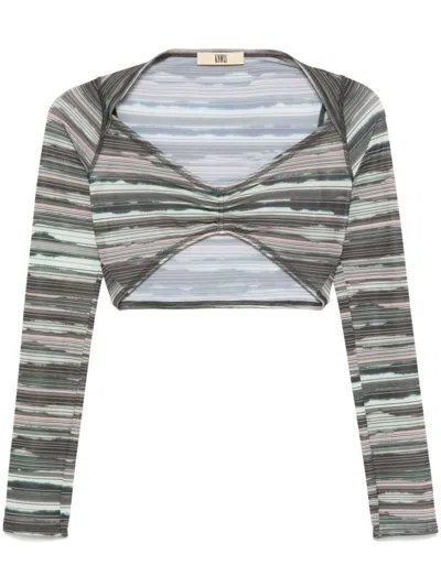 鼠尾草绿色/彩色 弹力平纹针织 横条纹 漂白效果 U形领 长袖 缩褶细节 短款 平直下摆