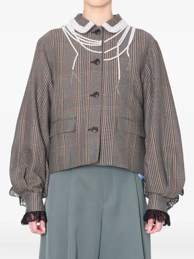 褐色 格纹图案 钮扣 灯笼袖 蕾丝边饰