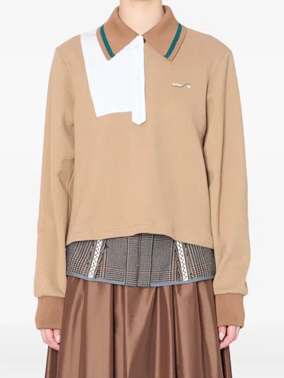 米色 华夫格纹理 百褶拼接 长袖 polo领 对比滚边