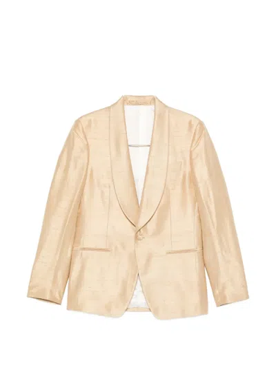 金色 真丝 青果领 正面平袋 钮扣开合 长袖 单排扣