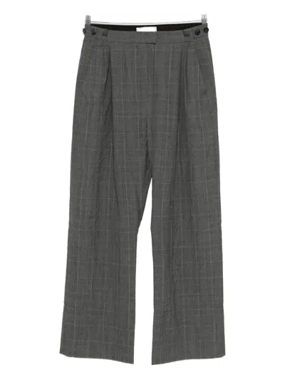 灰色 格纹图案 正面褶饰 钮扣 高腰 羊毛