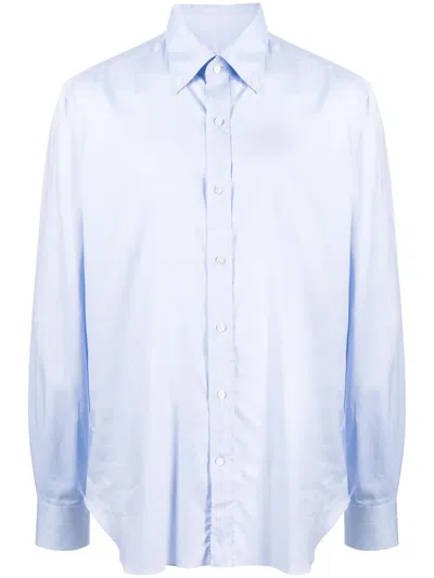 浅蓝色 棉 同色系缝线细节 扣角领 正面纽扣 长袖 搭扣袖口 弧形边