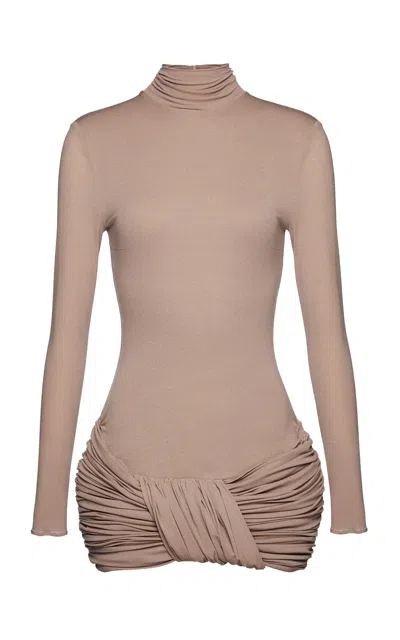 beige high neckline long sleeves gathered ruching at sides form-fitting silhouette subtle back zip fastening
