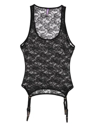 黑色 环保再生聚酰胺混纺面料 透明蕾丝层搭 方领 无袖 紧身设计 吊袜带细节 请注意,试穿这款商品时,请穿着于自身衣物之外。 这款商品含有至少 50% 环保回收或环保再生材料。对于环保再生合成服装商品,我们强烈推荐使用微纤维防渗洗衣袋,以确保洗涤过程中不会释放污染水源的微塑料。 前往“至善前瞻标准”专题页,了解更多信息