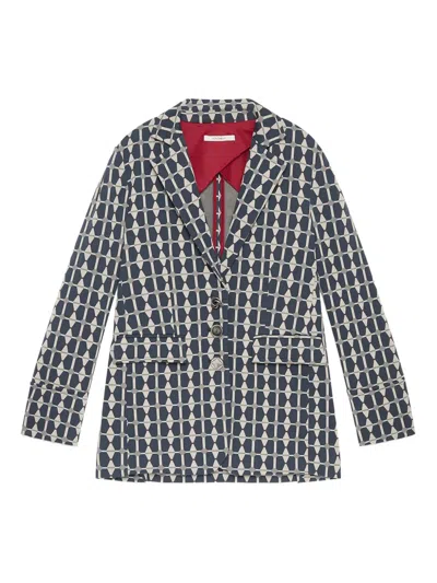 海军蓝色 几何花纹 平驳领 长袖 钮扣 盖袋