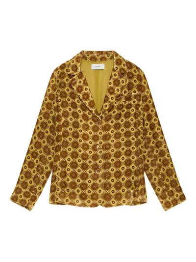 芥末黄色 几何花纹 正面纽扣 翻领领口 长袖 搭扣袖口