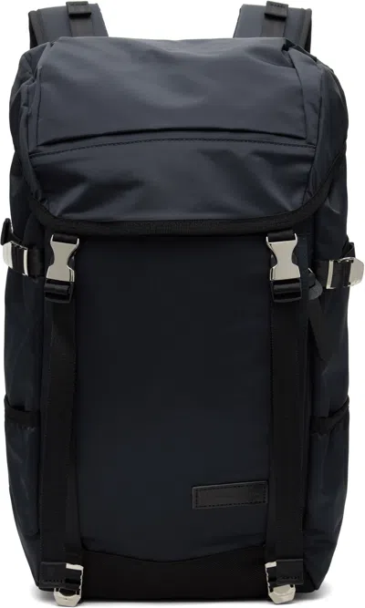 Water-repellent CORDURA Ballistic® nylon twill backpack in navy. · Vegetable-tanned buffed leather trim throughout · Webbing carry handle · Adjustable padded shoulder straps · D-ring at shoulder straps · Logo patch and zip pocket at face · Cinch strap and patch pocket at sides · Padded canvas back face · Zip opening at back face · Cinch straps at base · Press-release flap · Cord-lock drawstring closure · Zip pocket and laptop compartment at interior · Nylon canvas lining · H20 x W16 x D7 Supplier color: Navy