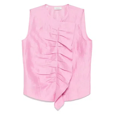 rose pink concealed front button fastening crew neck sleeveless ruffled trim. Colour. : Pink. Composition. : Silk: 13.0%, Linen/flax: 87.0%. Country Of Manufacture. : Italy. MPN. : B3353BARBARA. Size Family. : IT. .
