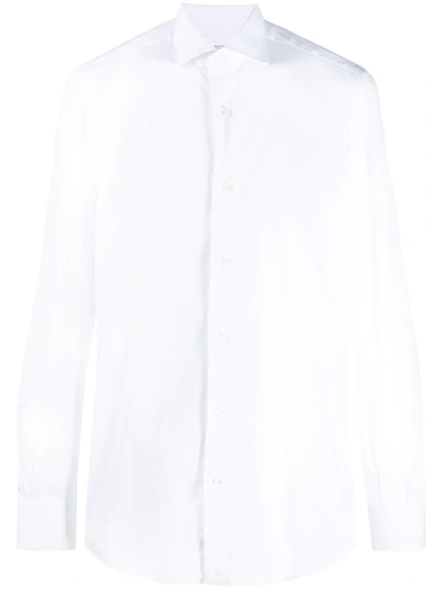 White cotton blend plain buttoned shirt from Mazzarelli featuring a spread collar, a front button fastening, long sleeves, button cuffs and a curved hem.