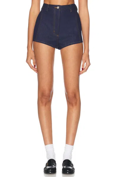 Mimchik Tap Short in Indigo - Blue. Size 29 (also in 24, 25, 26, 27, 28). Self: 68% cotton 32% polyester Lining: 100% cotton. Made in USA. Machine wash. Zip fly with button closure. Back welt pockets. Denim fabric. Item not sold as a set. MMCF-WF4. MC242A0506IND. About the designer: