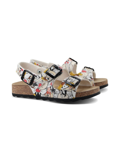 白色和多色、卡通印花、鞋垫饰有标志、露趾、双带设计、侧置搭扣、橡胶鞋底。