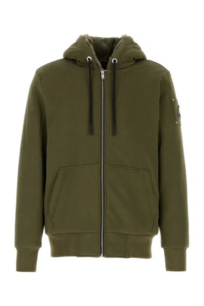 绿色 棉质混纺 平纹针织纹理 正面饰有双向拉链 抽绳兜帽 长袖 罗纹袖口和下摆 logo标牌 两侧饰有口袋 迷你logo吊牌 绗缝人造皮草衬里 平直下摆