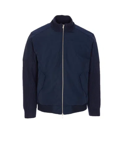 海军蓝色 拉链开合 衬垫拼接 针织衣袖 搭扣口袋 标贴