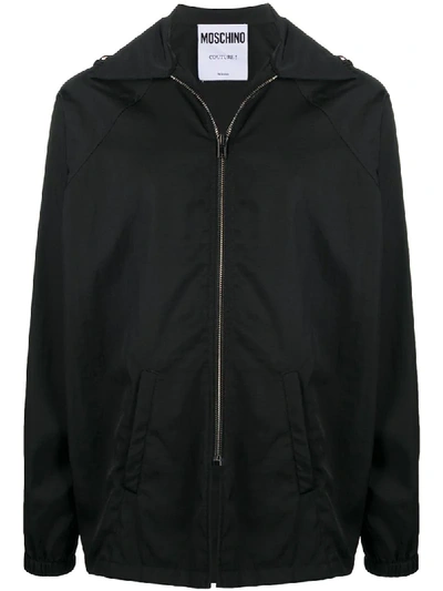 Black/white logo print windbreaker from MOSCHINO featuring drawstring hood, spread collar, front zip fastening, long raglan sleeves, elasticated cuffs, logo print to the rear and two front slit pockets.