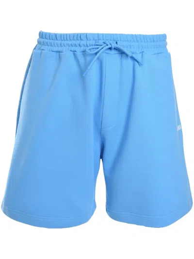 sky blue elasticated drawstring waistband logo print at the leg two side slit pockets rear patch pocket