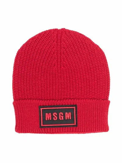 MSGM Ribbed-knit Logo-patch Hat In 红色