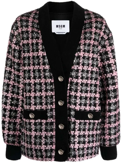 黑色、粉红色、粗花呢、对比边饰、深V领、无翻领、正面纽扣、长袖、束口袖、两个正面平袋、平直下摆。