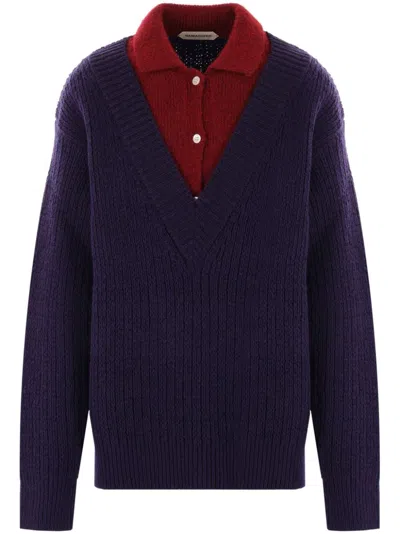 海军蓝色/酒红色 羊毛混纺 罗纹针织 层搭设计 正面纽扣 polo领 落肩 长袖 罗纹边饰 平直下摆