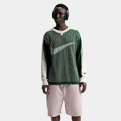 Size & Fit Loose fit is oversized and roomy Product Features Flat-knit cotton fabric with added stretch for premium comfort and warmth Pinstripes on the front and a jacquard Swoosh supply heritage energy Contrast collar and stripes on the sleeves add visual depth Ribbed crew collar for a classic look and stay-put fit 98% cotton, 1% polyester, 1% spandex Machine wash The Nike Sportswear Club Jersey Sweater is imported. The Men's Nike Sportswear Club Jersey Sweater refreshes the classic sweatshirt for modern style, combining cozy comfort for chilly nights with classic sportswear style for the streets. A loose fit and premium cotton construction with just a tad bit of stretch go all-in on casual, cloud-like comfort, while pinstripes, a jacquard Swoosh, and contrast detailing bring sport-inspired style, making it a leveled-up staple when stepping out on nights and weekends. Nike Men's Sportswear Club Jersey Sweater in Fir/Sail