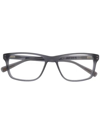Dark grey rectangular frame glasses from Nike featuring rectangular frames, straight arms with angled tips and a logo to the arm. This item comes with a protective case.