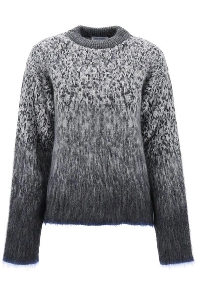 Off White sweater crafted in brushed mohair wool blend yarn with gradient effect and jacquard Arrow motif on the back. It features ribbed crew neck and contrasting trim on the hem. Relaxed fit enhanced by low-set sleeves. The model is 177 cm tall and wears size IT 38. This garment is foldable in its supplied box.