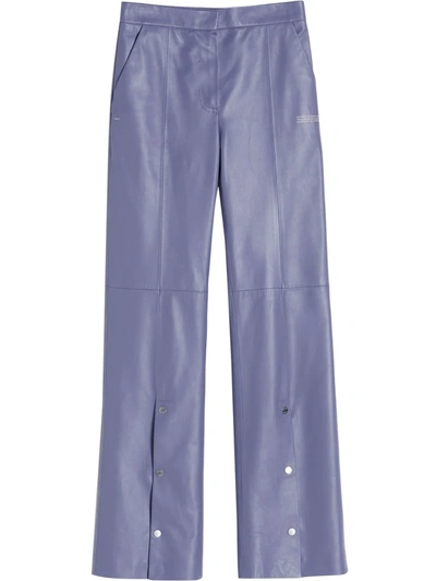 Grey leather snap split flared trousers from OFF-WHITE featuring high waist, concealed front fastening, logo print at the leg, side slits, rear welt pocket, snap-button fastening and flared.