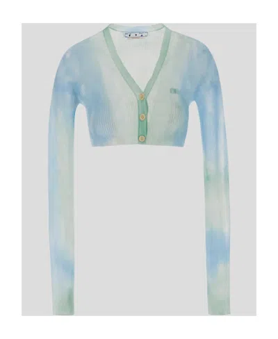 Off-White cropped cardigan made of light blue fabric with tie-dye effect. Long-sleeved design with V-neckline and three-button fastening. Composition: Composition: 70% Polyamide, 30% Polyester.