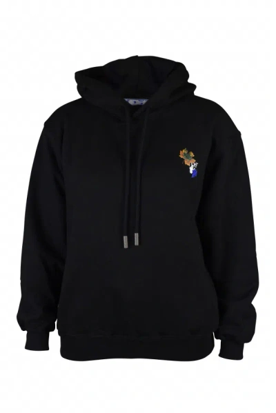 Off-White black hooded sweatshirt.White cross on the back with foliage pattern.Logo on the front with leaf pattern.Drawcords.100% cotton.