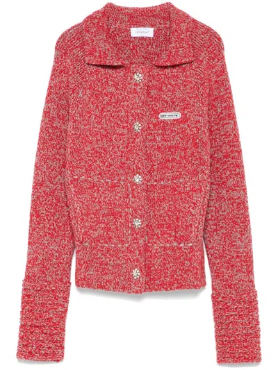 红色/灰色 羊毛 针织面料 混色效果 水钻缀饰纽扣 宽领 胸处饰有橡胶logo 插肩式长袖 罗纹细节 侧置两个插袋 平直下摆