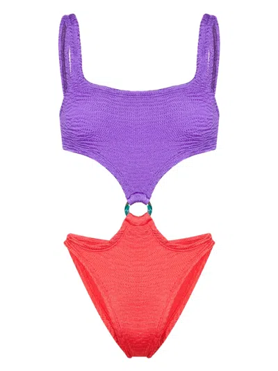 紫色/红色 弹性设计 纹理效果 拼色设计 圆环细节 镂空细节 方领 无袖 高衩 无衬里 套穿式 请注意,试穿泳装类商品时,请穿着于自身衣物之外。