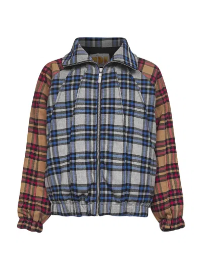 灰色 格纹拼贴效果 全拉链开合^高领 插肩式衣袖 弹性松紧边 弹性松紧边 侧置口袋