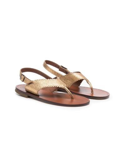 金色、皮质、扇贝形边、搭扣露跟袢带、人字袢带、露趾、橡胶平底。