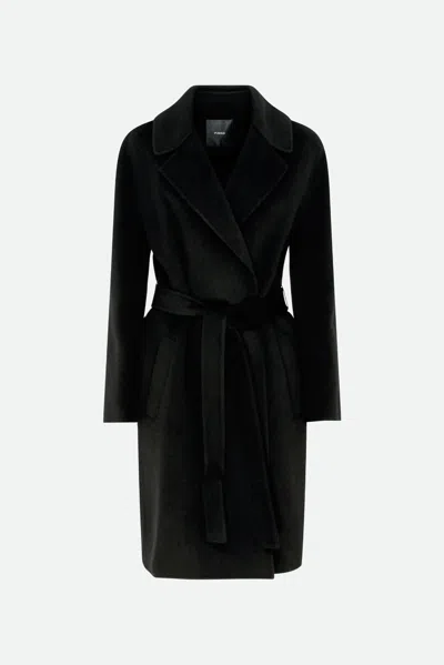 Black dressing gown coat by Pinko with removable belt fastening, two welt pockets on the front and brand logo on the internal label. Composition: 100% Wool