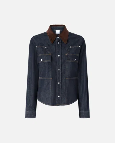蓝色 弹性棉质 牛仔 对比缝线 对比领 胸前饰有两个贴袋 长袖 搭扣袖口 弧形边
