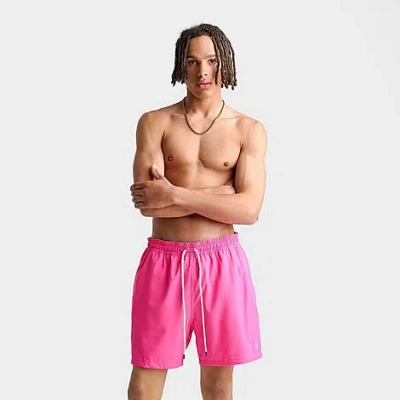 Size & Fit Standard fit is athletic and relaxed Length hits near the thigh Product Features Lightweight and crinkly fabric with a subtle sheen for water-friendly comfort Minimalistic design with a tonal Pony logo above the left hem for subtle signature style Gathered elastic waistband with an adjustable drawstring for a personalized fit Elastic waistband with drawcord ensures a personalized fit Vintage-style Polo Ralph Lauren woven label on the rear waist Side pockets and a hook-and-loop back pocket for on-the-go essentials Machine wash The Polo Ralph Lauren Traveler Swim Shorts are imported. Elevate your summertime attire with the Men's Polo Ralph Lauren Traveler Swim Shorts. In true Ralph Lauren fashion, these swim shorts keep it simple, classic, and timeless, with a tonal Pony logo and retro label on the waist, accenting the crinkly fabric for a versatile piece that looks and feels great in or out of the water. Polo Ralph Lauren Men's Traveler Swim Shorts in Baja Pink