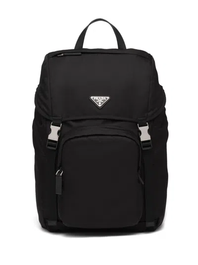 This nylon backpack is an evolution of the iconic Prada style since the 1980s and is made of recycled nylon, a recycled yarn made from recycled, purified plastic waste collected from the ocean, fishing nets and textile waste. This technologically innovative fabric is paired with Saffiano leather, a historical material in the Prada tradition, defined by its cross-line pattern and waxed finishes. The enameled metal triangular logo highlights the compact design with flip cover and oversized front pocket. leather handle Adjustable braided nylon shoulder strap Enamelled gold triangular logo on flip cover Push latch on flip cover Four external zipper pockets Padded mesh back Interior with zippered pockets and sticker pockets recycled nylon lining