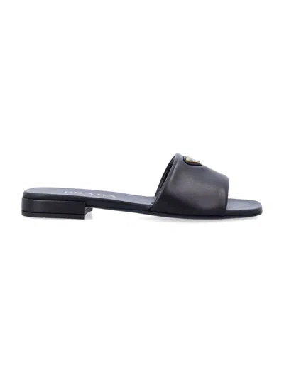 Flat slide nappa soft by Prada.Featuring:Band in soft nappa leatherSlide designBand with enameled triangle logoLeather sole with golden logo