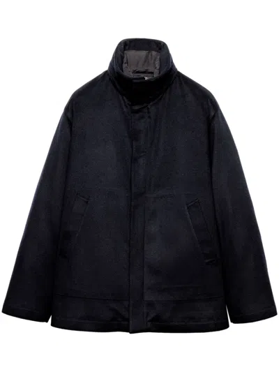 Prada features a medium cashmere down jacket with a sporty design, with an oversized fit and essential details such as a stand-up collar and a hidden removable hood. - Medium down jacket - Color: Blue - Made of cashmere - Oversized fit - Stand-up collar - Straight sleeves - Zip and button closure - Welt pockets - Straight cuffs and hem - Removable hidden hood - Triangle logo in fabric and enameled metal - Calfskin details