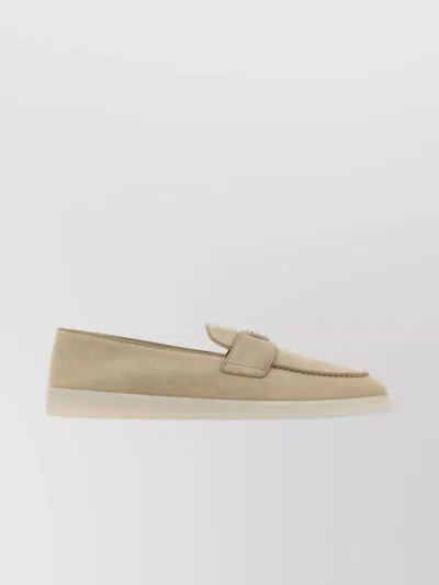 Pradas leather loafers feature an almond toe and a sleek suede design. the contrasting flat sole adds a modern touch, while the logo-embossed insole lends a distinctive and recognizable detail. a pair of refined loafers perfect for a sophisticated and timeless look. Composition: 100% % Rubber, 100% % Calf Leather Bos Taurus