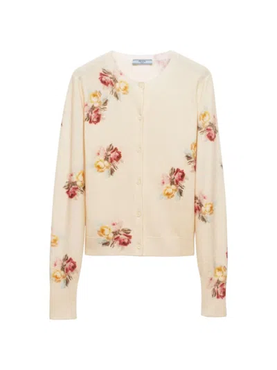 Virgin Wool Cardigan by Prada, ribbed crew neck, button front closure, ribbed neckline, ribbed hem, floral pattern on front and back, regular fit. Brand. : Prada. Color. : WHITE. Made In. : IT. Composition. : FLEECE WOOL: 100% . MPN. : P25M97SOOO15ITF062744. .