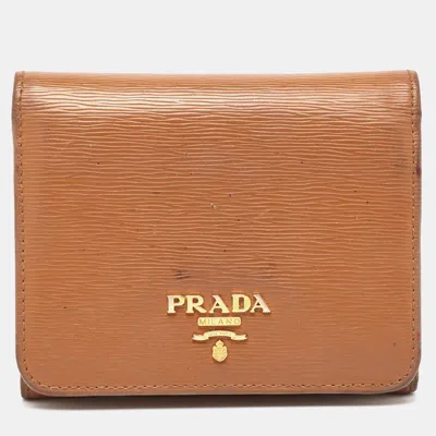 Crafted from Prada's signature Vitello Move leather this tan trifold wallet blends timeless design with practical sophistication. The textured finish enhances durability while the compact silhouette unfolds to reveal multiple card slots a bill compartment and a snap button coin pocket. Finished with the iconic metal logo it's a refined essential for everyday elegance.