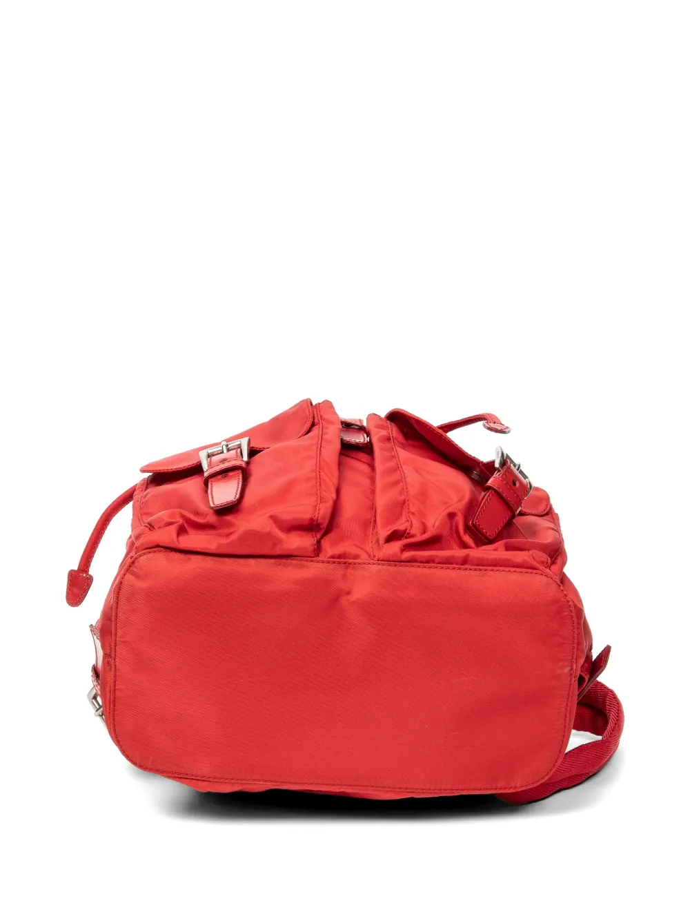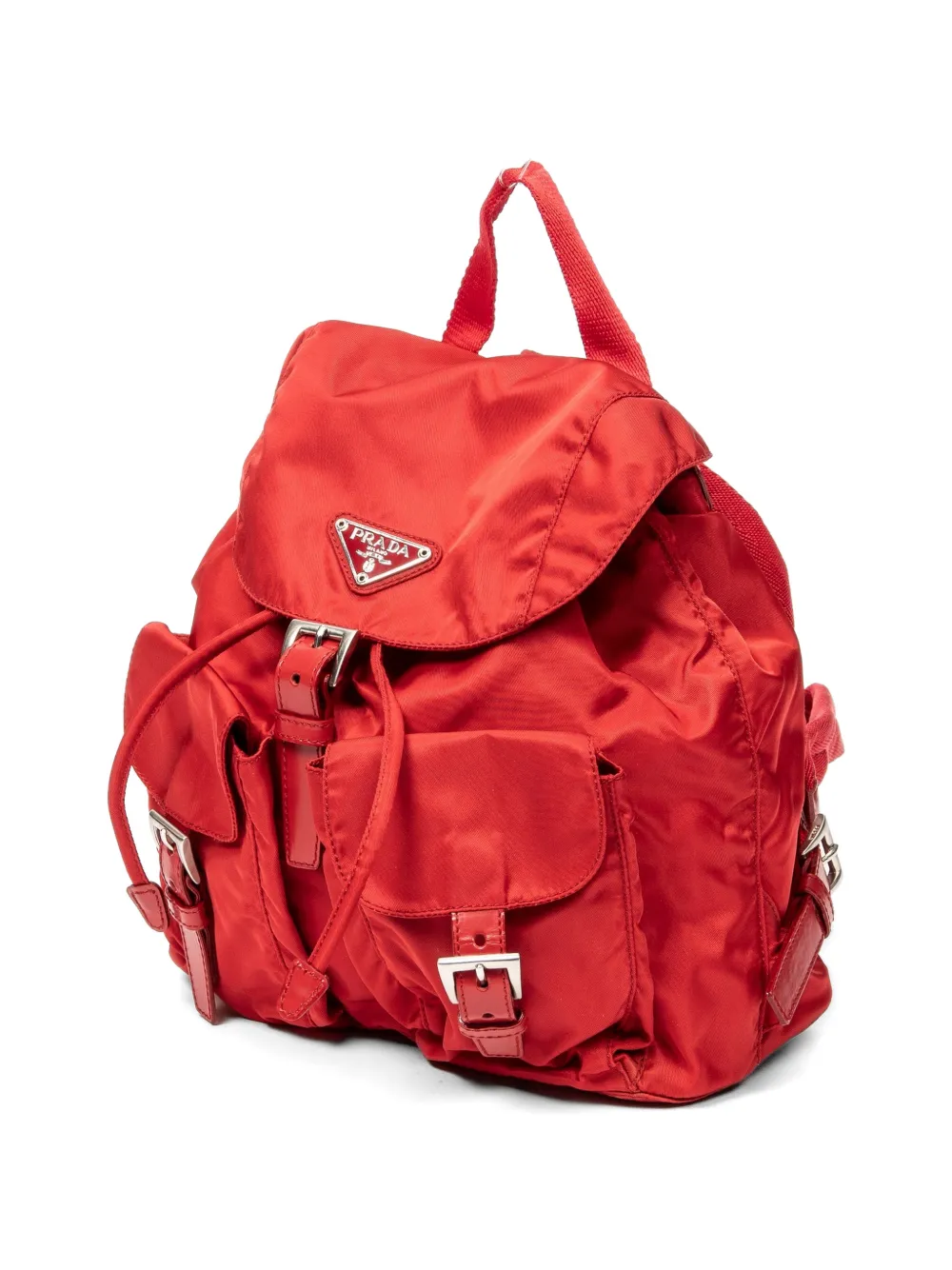 red top handle foldover buckle fastening drawstring fastening triangle logo two front flap pockets main compartment