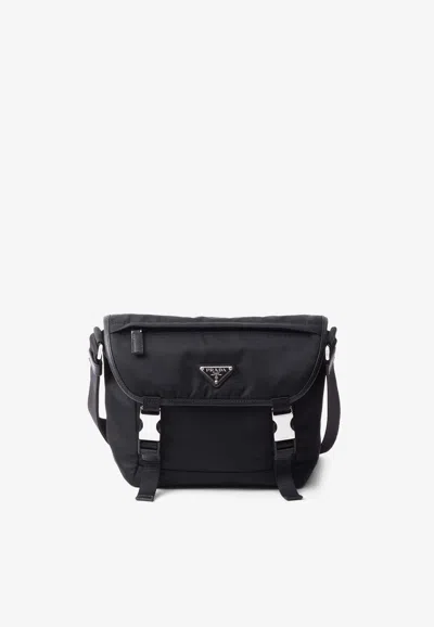 Two iconic Prada materials enrich the design of this shoulder bag that combines refined Saffiano leather with the pragmatic touch of innovative Re-Nylon. The accessory, defined by sports-inspired details, is completed by the emblematic enameled metal triangle logo. For sustainable care to preserve the product's characteristics and reduce microfiber shedding, we recommend not washing the item too often. Let the product air out after every use and have it dry cleaned at a specialized ecological dry cleaners.   Highlightsblackrecycled nylonSaffiano leather trimsilver-tone hardwarelogo patch to the frontadjustable shoulder strapfront zip-fastening pocketfoldover topinternal logo patchslide-buckle fasteninginternal zip-fastening pocketrear zip-fastening compartmentThis piece comes complete with a protective dust bag.   CompositionOuter: Recycled Nylon 100%, Leather 100%