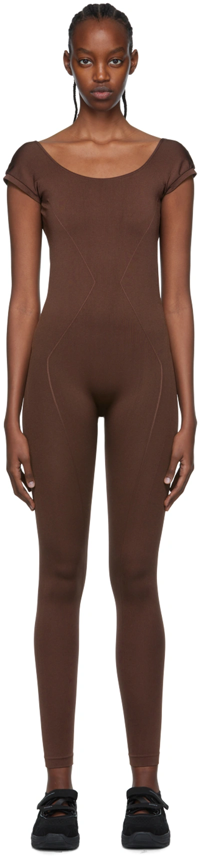Stretch nylon jersey unitard. Moisture-wicking, chlorine-resistant, and quick-drying. · Scoop neck · Rib knit cuffs · Low back Supplier color: Chocolate